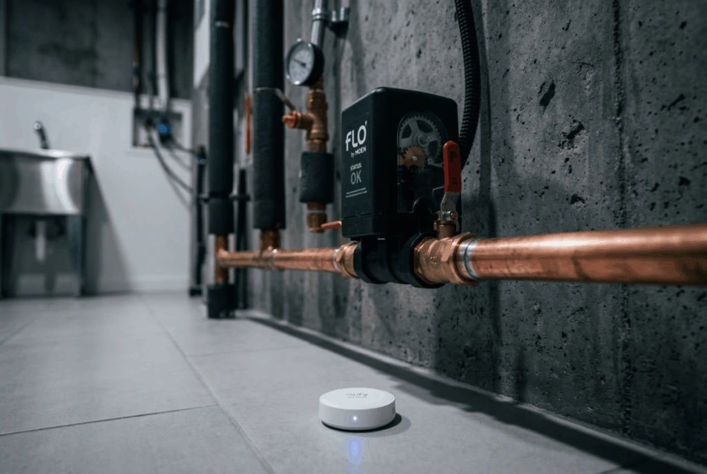 - Na głównym przyłączu wody w budynku zamontowaliśmy masywny, sterowany elektronicznie elektrozawór. W newralgicznych punktach (pod zlewami, przy pralce, zmywarce i w rozdzielaczach CO) rozmieściliśmy dyskretne, bezprzewodowe czujniki zalania.